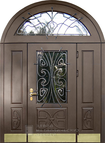 Наружная дверь с усиленным каркасом и остекленной фрамугой №46 рассчитана на парадный вход в частный дом или коттедж: высокая арочная форма, массив дуба с двух сторон, ковка и стеклопакет добавляют света и статуса, без показной позолоты. В наружной двери с усиленным каркасом и остекленной фрамугой №46 декоративность не мешает прочности: лист холоднокатаной стали 2 мм, каркас и полотно из профтрубы 50×25 мм, два ребра жёсткости и противосъёмные блокираторы. Запирание — связка Просам (сувальдный) и Мосрентген (цилиндровый), по 3 ригеля каждый. Размер изготовим любой; открывание — левое или правое, наружу или внутрь на выбор. По желанию поставим наличники и доборы в цвет, видеодомофон и заменим замки на Гардиан, Border, Cisa, Kale Kilit, Эльбор, Mottura или умные биометрические. Наружная дверь с усиленным каркасом и остекленной фрамугой №46 по выгодной цене с доставкой и установкой в от производителя.